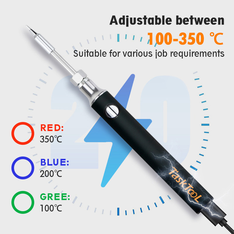 Adjustable from 100 to 350℃, suitable for various working requirements.8-second rapid heating, higher work efficiency.USB power supply, compatible with any power bank, charging head or other output devices.